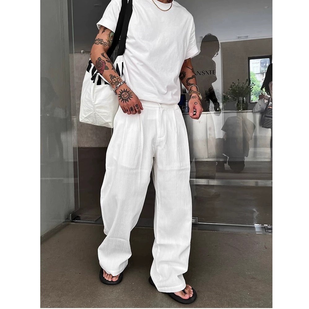 2025 Summer American Vintage Textured Soft Single-Pleat Straight Casual Pants for Men, Loose Wide-Leg Long Trousers in White
