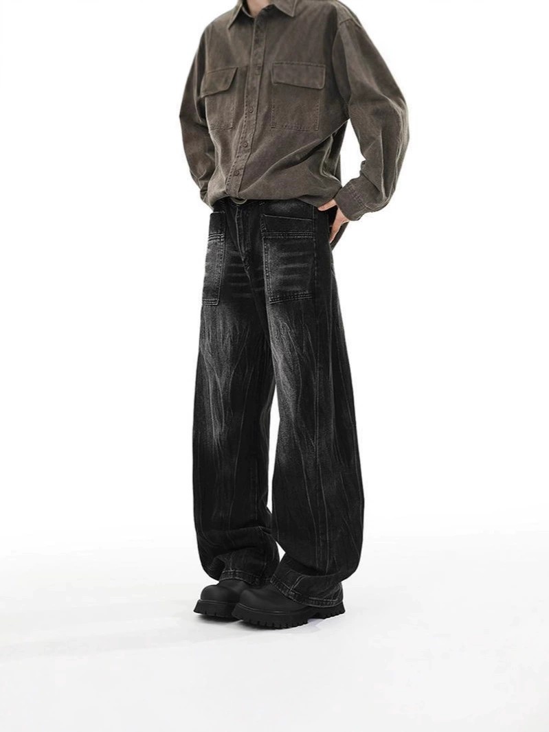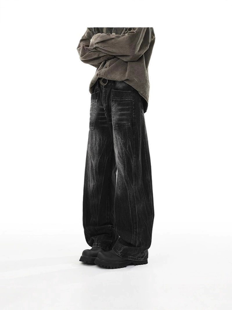 Experience premium comfort and style with these black washed denim jeans featuring a unique lightning pattern. Crafted from polyester-blend fabric with a slight stretch, these high-waisted straight-leg pants offer a relaxed, loose fit ideal for youthful, fashion-forward individuals. Designed with wrinkle-free technology and water-wash treatment, they deliver durability and a fresh look through all seasons. Details like button closure, zipper decoration, and classic American street style make these jeans a versatile choice for urban casual wear, suitable for both men and women.