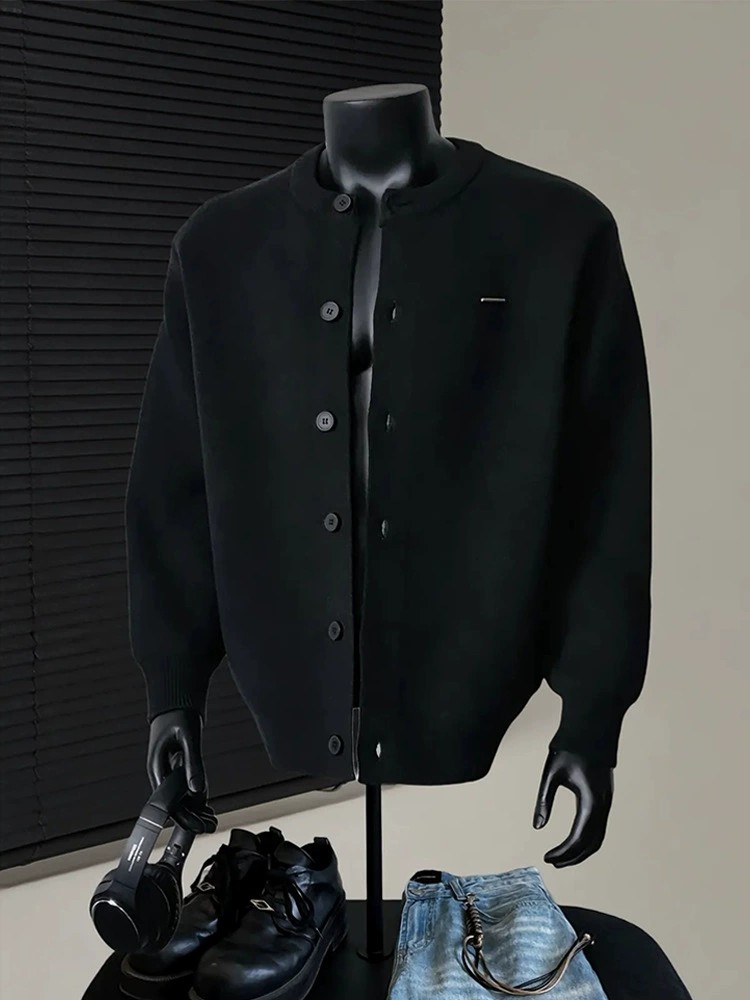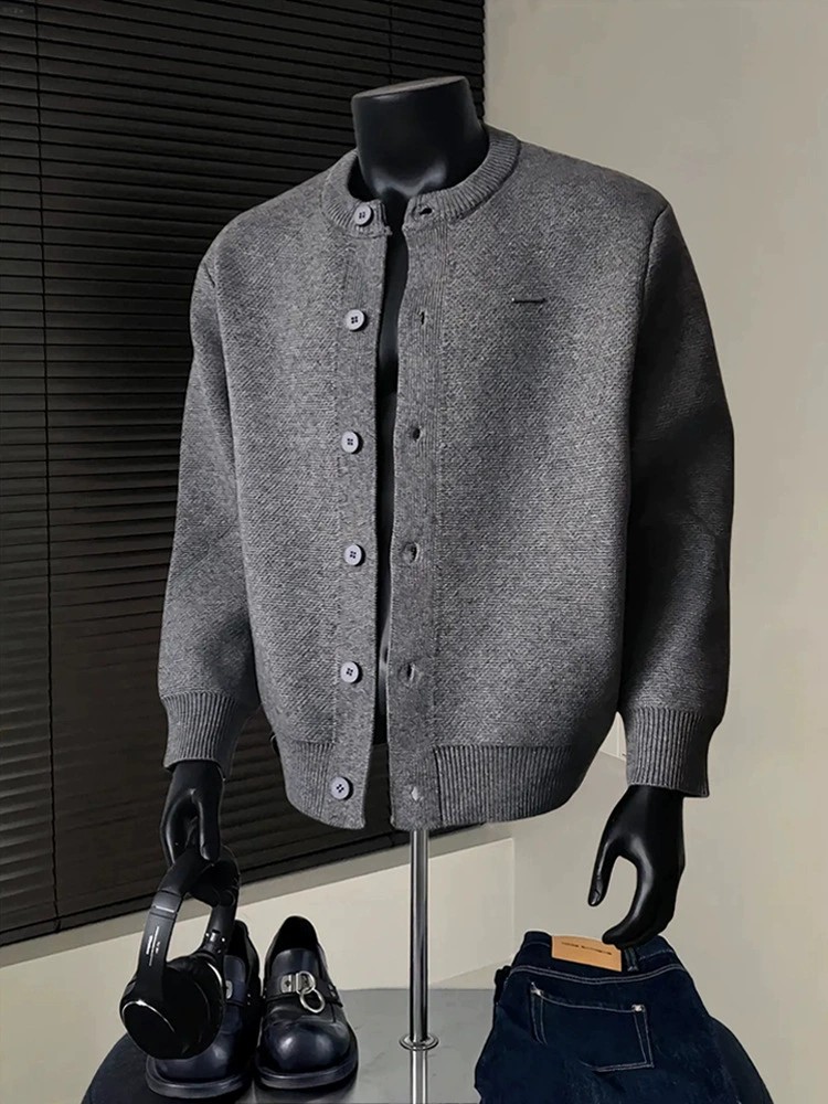 Stylish Cleanfit knit cardigan with breathable polyester fabric, loose fit, and wrinkle-resistant finish. Ideal for casual winter wear with classic round neck and vintage American-inspired design.
