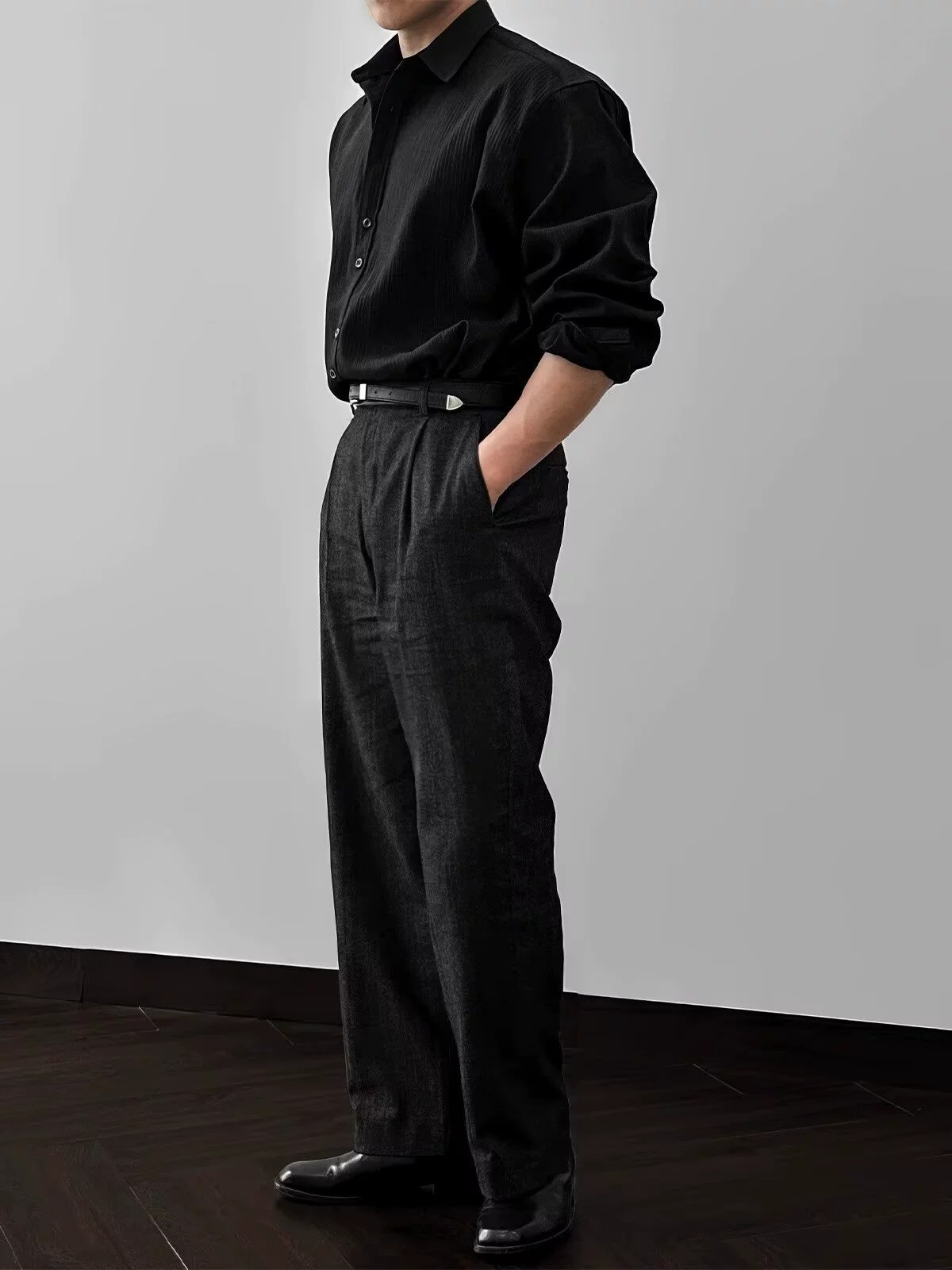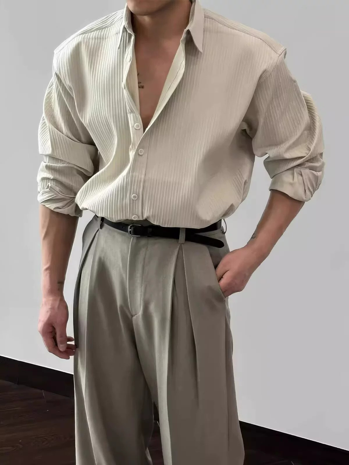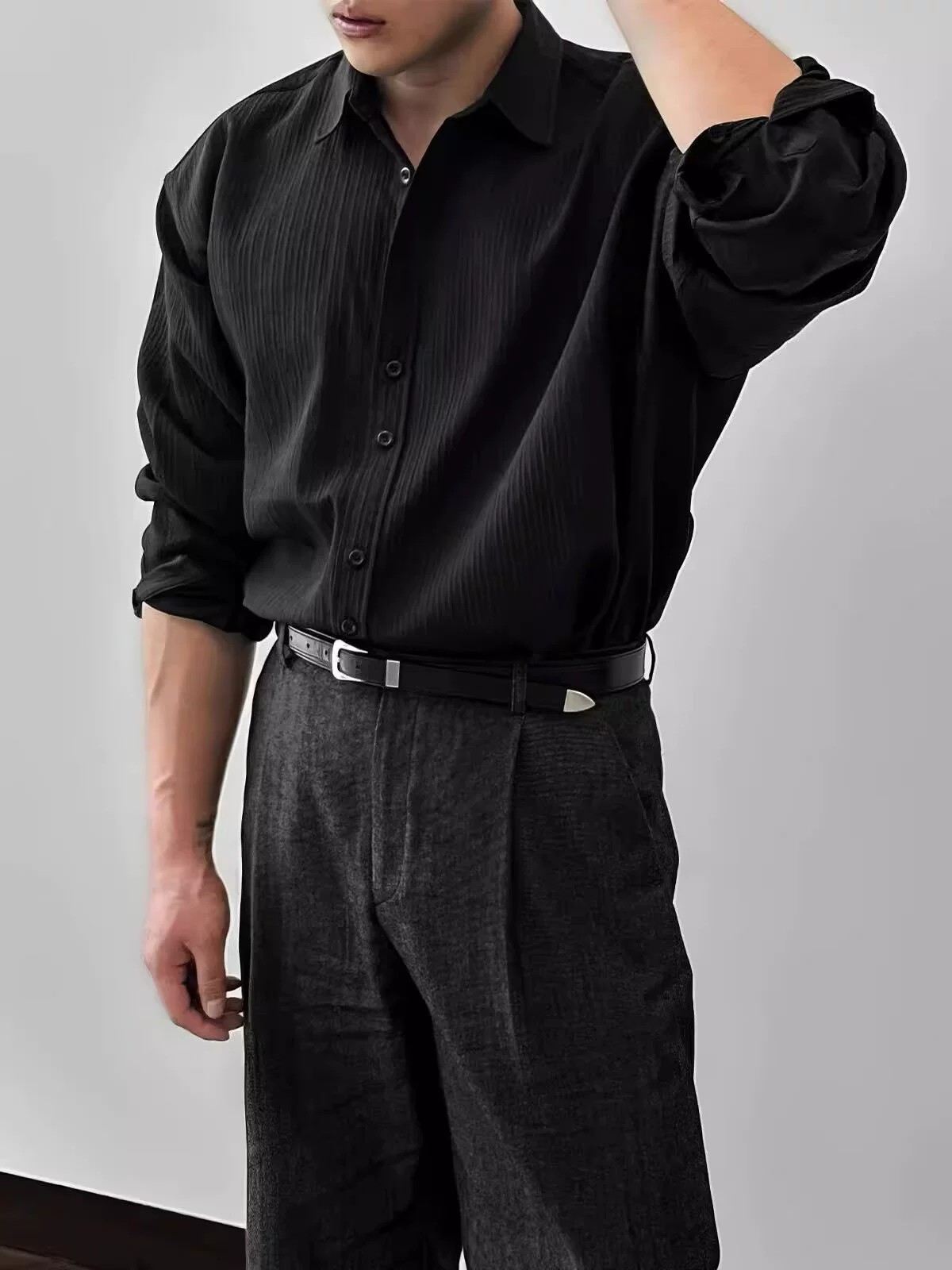 Elevate your wardrobe with this Korean-style men’s textured long sleeve shirt, crafted from high-quality wrinkle-free polyester for effortless care. Designed with a comfortable loose fit and classic collar, it offers both style and functionality. Available in white, black, and beige, this versatile shirt suits casual urban looks across all seasons. Ideal for young men seeking modern yet easy-going fashion, it pairs seamlessly with your favorite outfits for spring and summer 2025. Offered in sizes M to 2XL, this shirt is a must-have for contemporary menswear collections.
