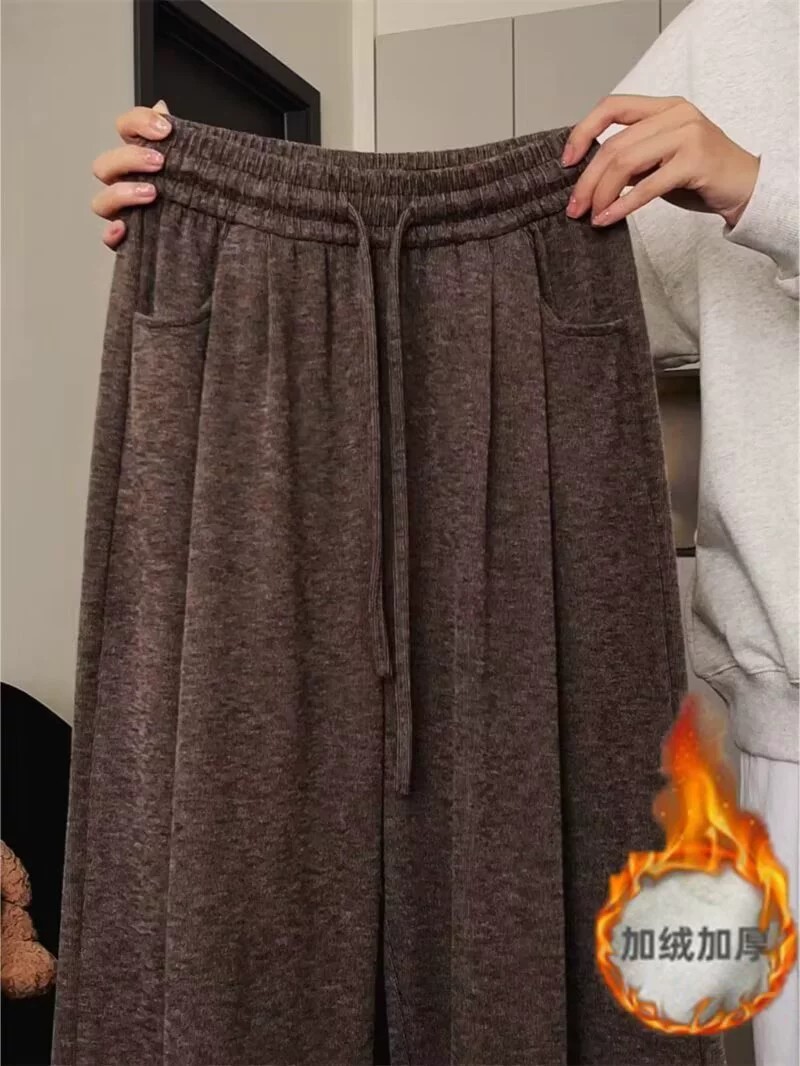 Durable, fleece-lined polyester straight-leg pants in brown or gray, perfect for casual winter wear with a relaxed fit and multiple pockets.