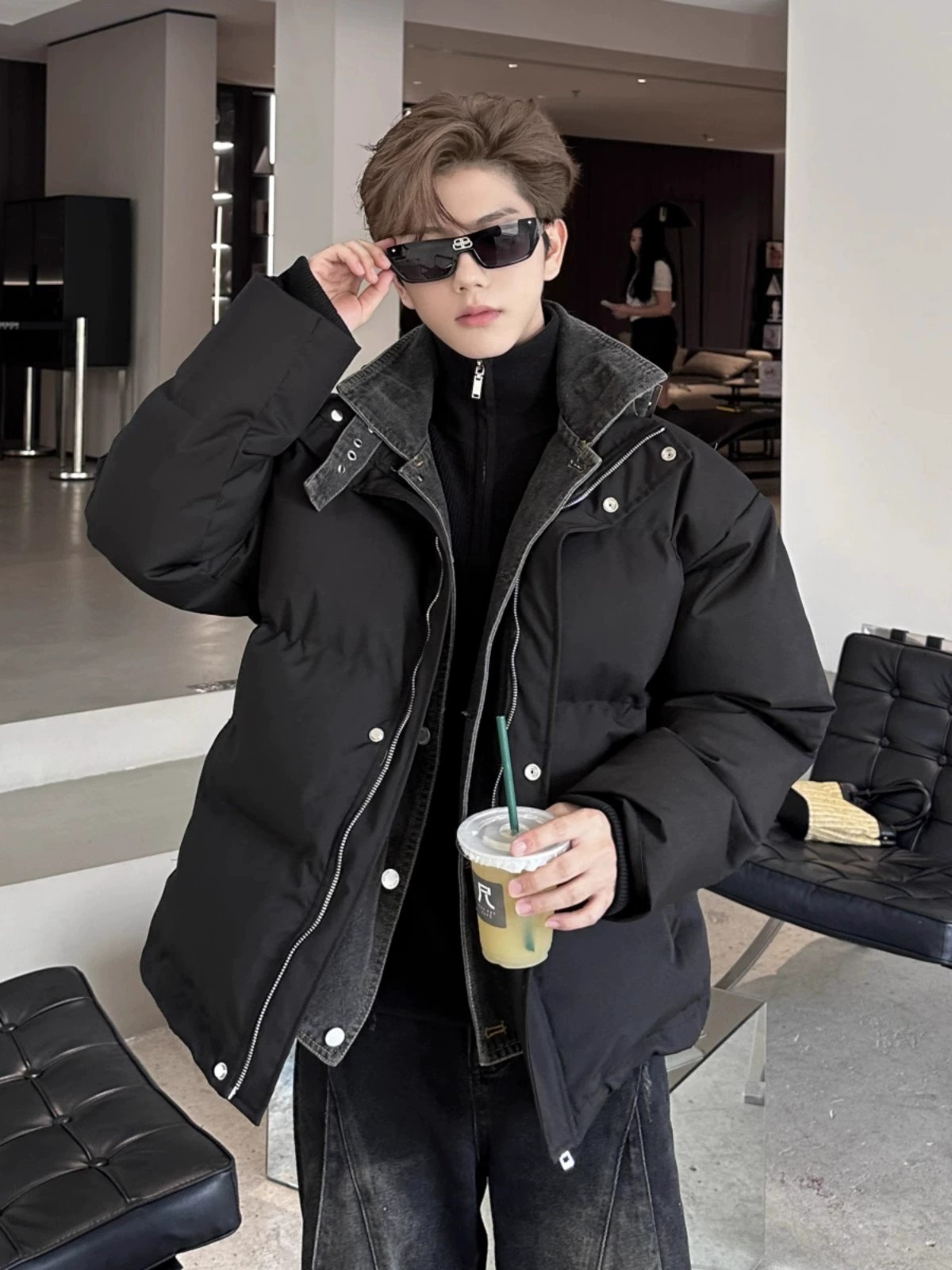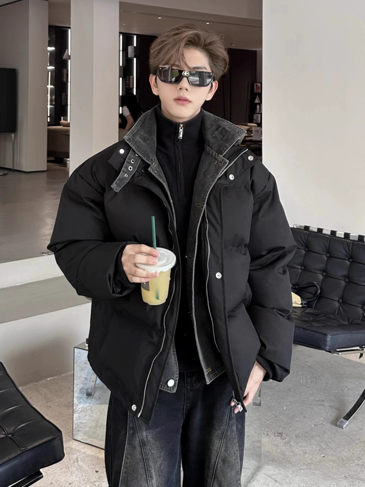 Designed for the modern man, this 2025 winter jacket combines warmth and fashion effortlessly. Crafted with thick cotton padding and durable polyester fabric, it features a unique denim-inspired layered look with color-block details. The stand collar and zip-up front provide extra protection against the cold, while the loose fit and side pockets offer comfort and practicality. Ideal for urban casual wear in cold seasons, this non-hooded jacket comes in classic black and white with a wrinkle-resistant finish. Available in sizes M to XXL, it caters to young trendsetters seeking both warmth and style.