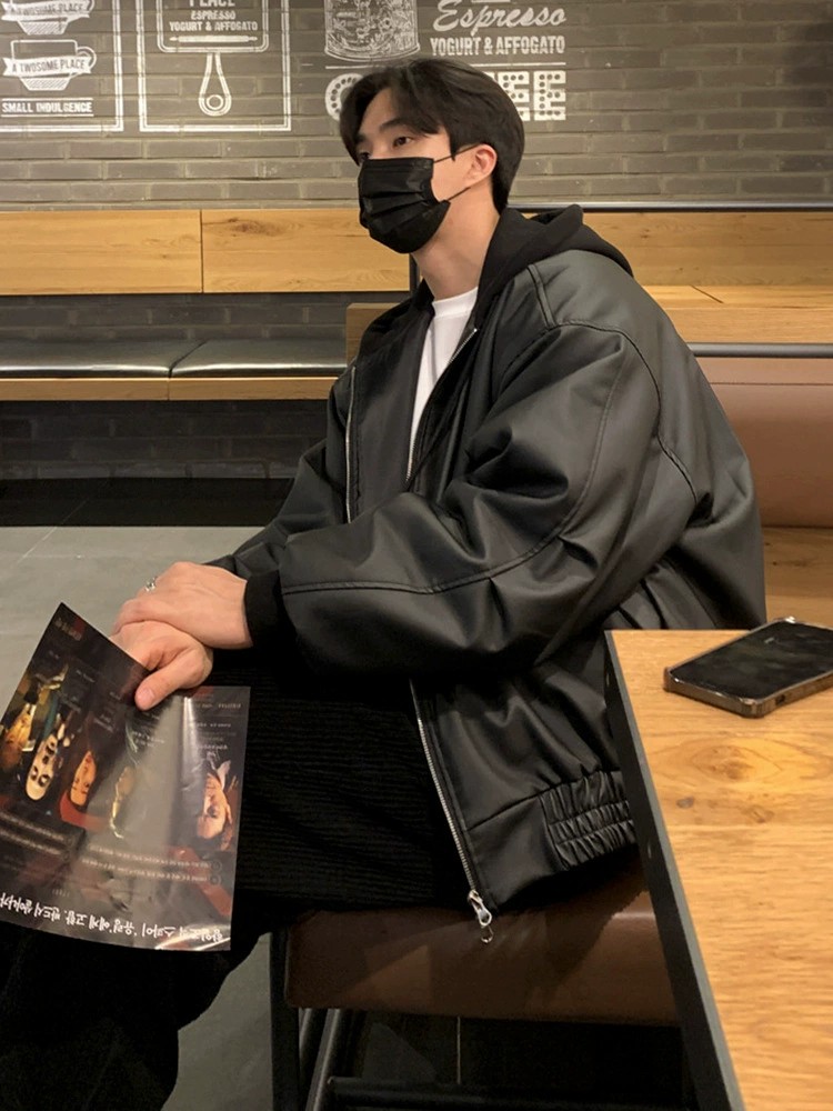 The MYQ Men’s PU Leather Hooded Jacket offers a contemporary Korean-inspired style with a relaxed fit that suits youthful fashion trends. Crafted from easy-care PU leather with wrinkle-free treatment, this black jacket features a zipper front, side pockets, and a straight hem for a modern silhouette. Designed for spring and autumn outdoor casual wear, it combines comfort and sophistication effortlessly. Available in multiple sizes (M, L, XL, 2XL), it’s a versatile wardrobe staple for young men seeking high-quality, on-trend outerwear.