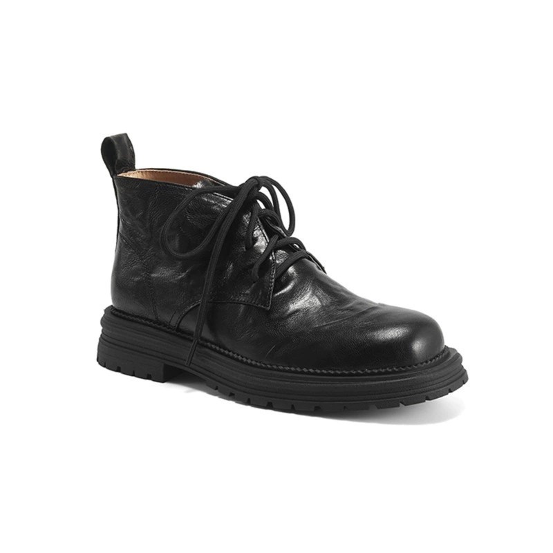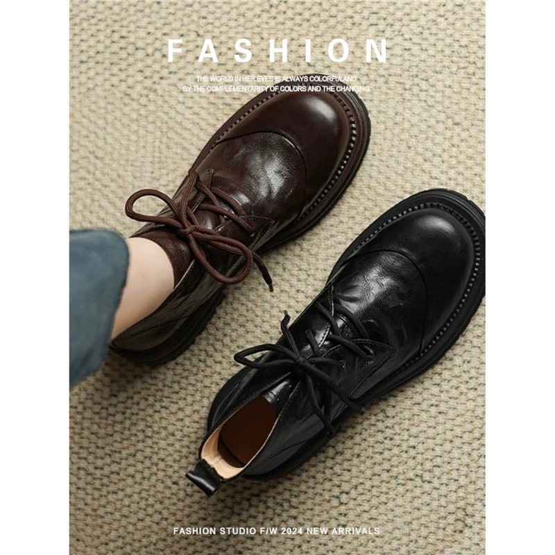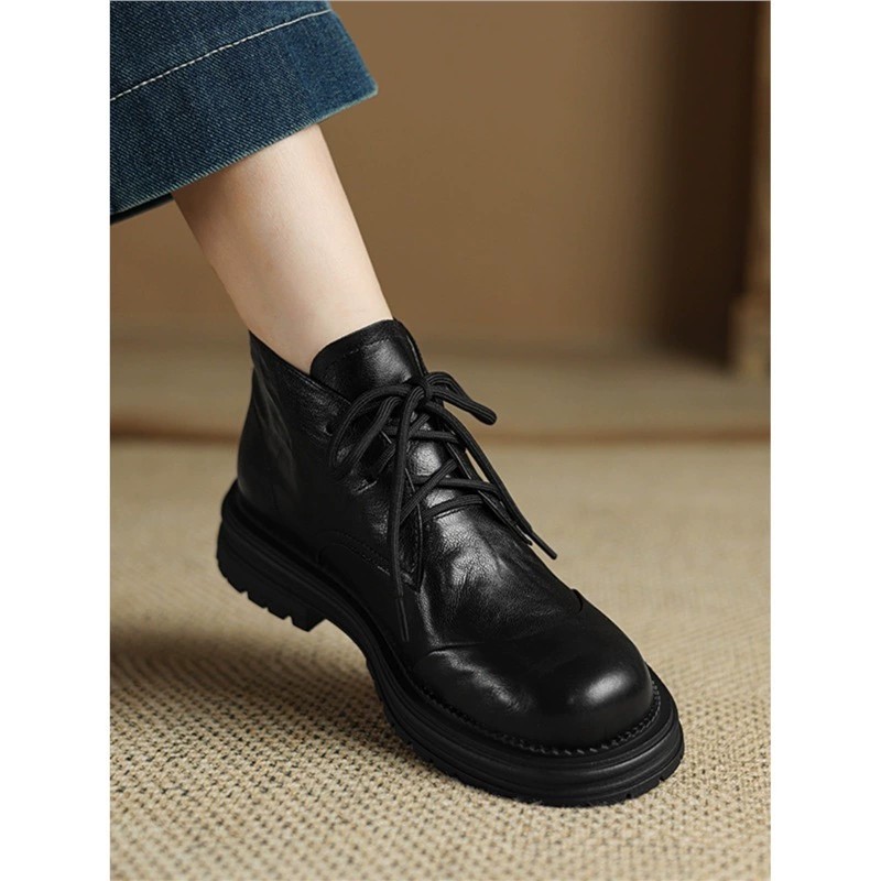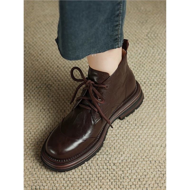 Crafted from premium first-layer cowhide leather with a pigskin lining and insole, these women’s Martin boots feature a soft rubber sole and a sturdy mid-height chunky heel (3-5cm) for all-day comfort. Designed with a low shaft and lace-up closure, they combine classic style with practical details like metal accents and waterproof platforms. Perfectly suited for autumn, winter, spring, and summer, these versatile boots fit easily into any wardrobe and deliver lasting durability and elegance. Choose from black or brown, with suede or smooth leather lining, in sizes 34 to 40.