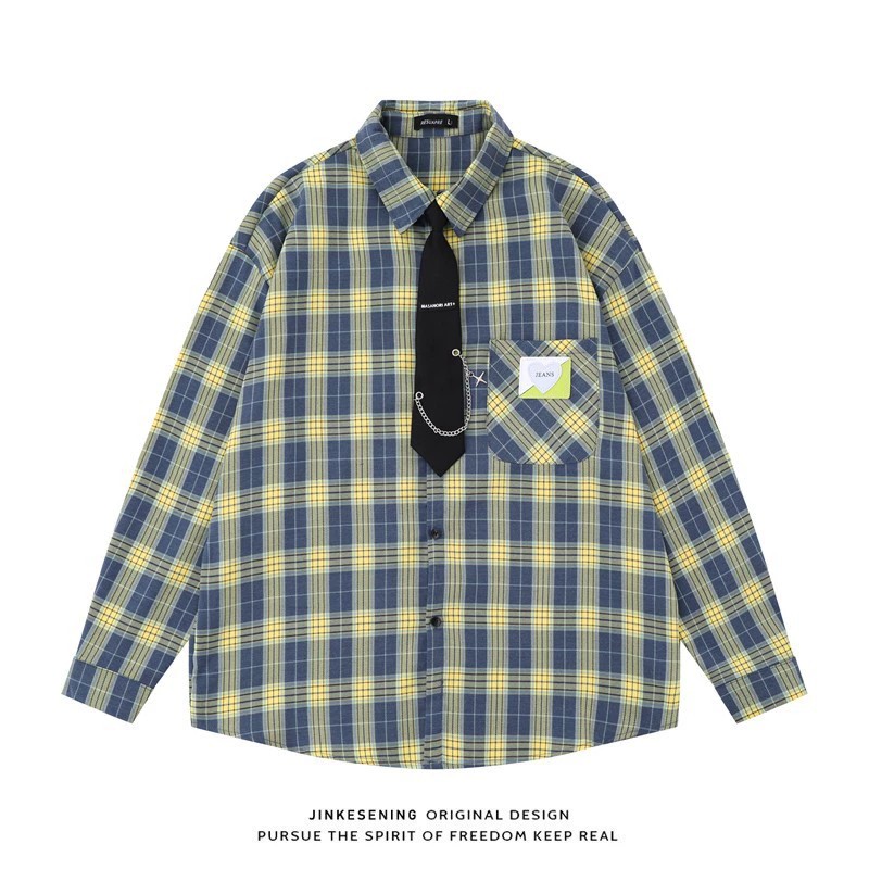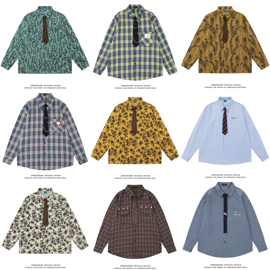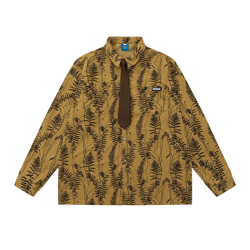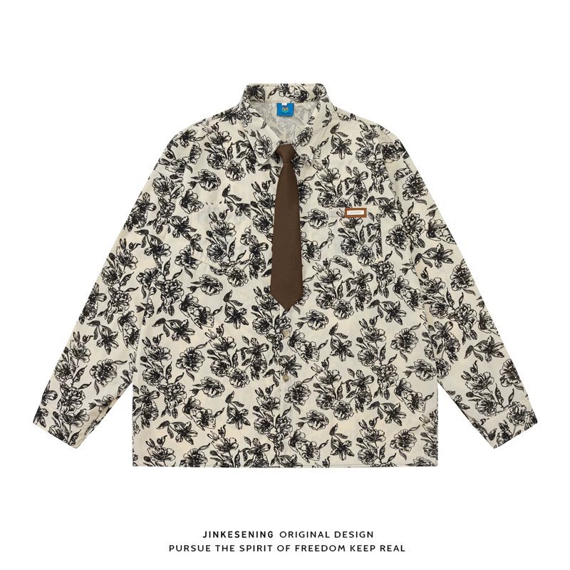 Breathable, wrinkle-free vintage shirt featuring floral and stripe patterns. Loose fit with breathable cotton blend fabric, includes stylish tie. Perfect casual autumn wear for young adults.