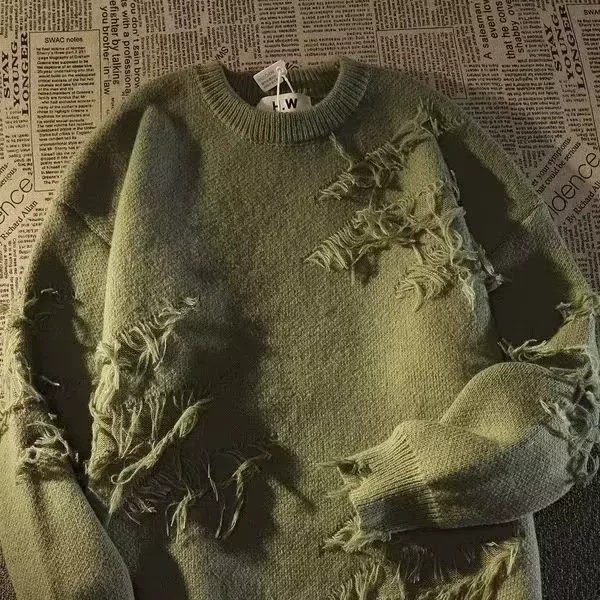 Embrace a vintage-inspired look with this American retro distressed knit pullover, designed for men and women who appreciate laid-back street style. Crafted from a high-quality acrylic blend fabric, it offers comfort with a loose silhouette and long sleeves. The sweater features trendy distressed accents for an edgy, youthful vibe, ideal for casual settings during autumn and spring. Its machine-washable, colorfast material includes wrinkle-free treatment for easy care and lasting style. Available in black and green, and sizes M to 3XL, this sweater combines practicality with elevated design for everyday fashion.